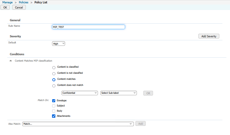 If you find the label you need to match, you can add the Content Matches MIP classification rule to your policy: