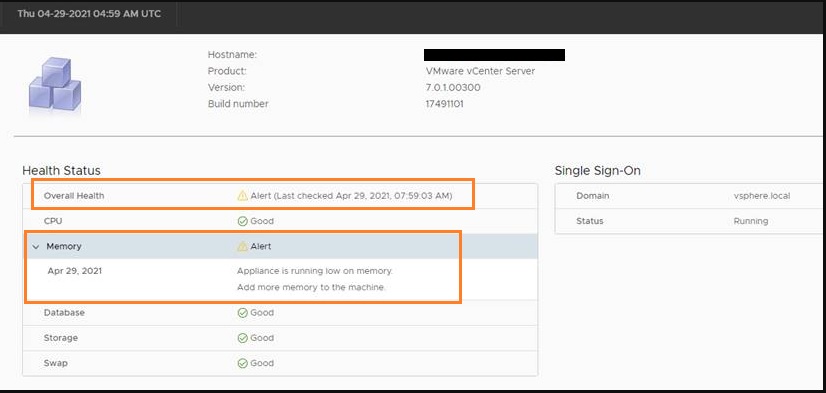 Summary page of vCenter Server Management Interface (VAMI) shows Overall Health & Memory in Alert Status with the message: "Appliance is running low on memory. Add more memory to the machine."