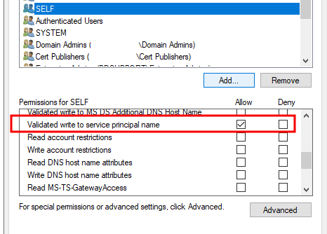 In this scenario, the Service account was a part of an AD Group that does not have rights to write to the service principal name: