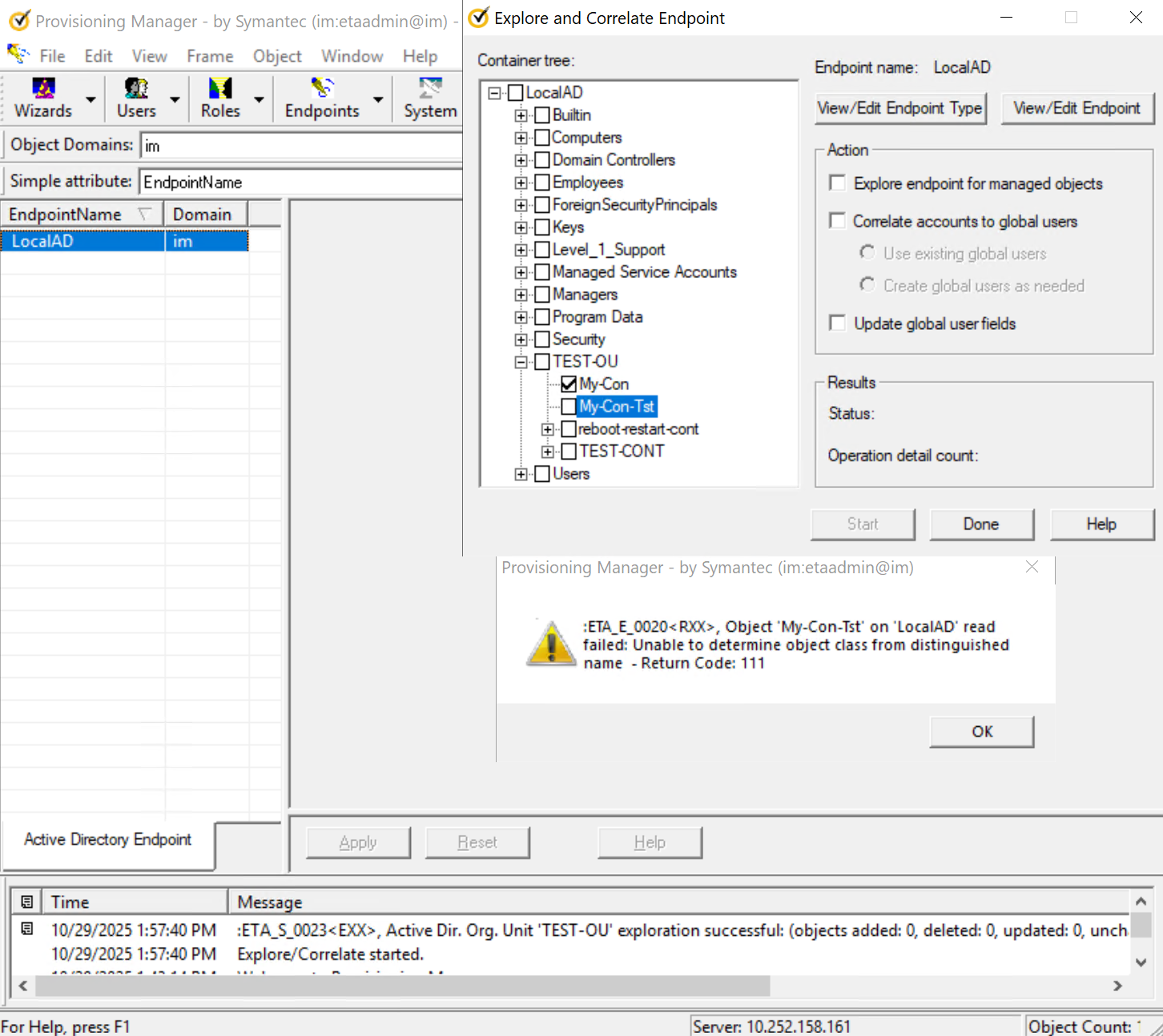 ETA_E_0020<RXX>, Object 'My-Con-Tst' on 'LocalAD' read failed: Unable to determine object class from distinguished name - Return Code: 111