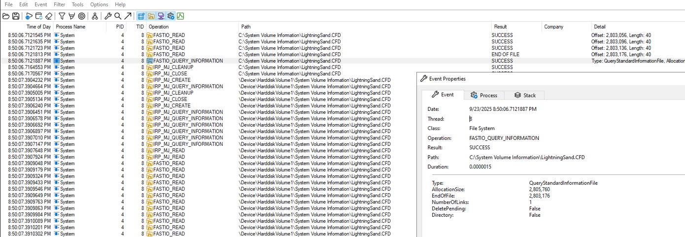 The Procmon low-altitude log shows the presence of the file and various properties that may be of interest.