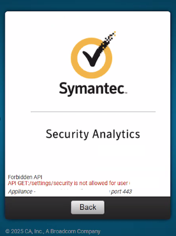 When trying to log in and access the Settings:/Security page, the following error message is presented: