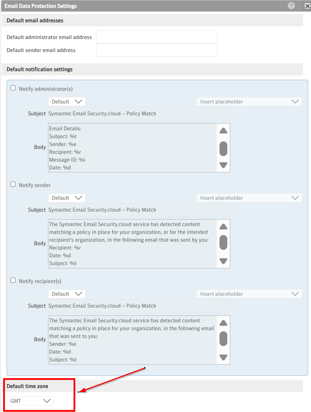 To define a default time zone at global level, select Services > Data Protection > Email Policies.