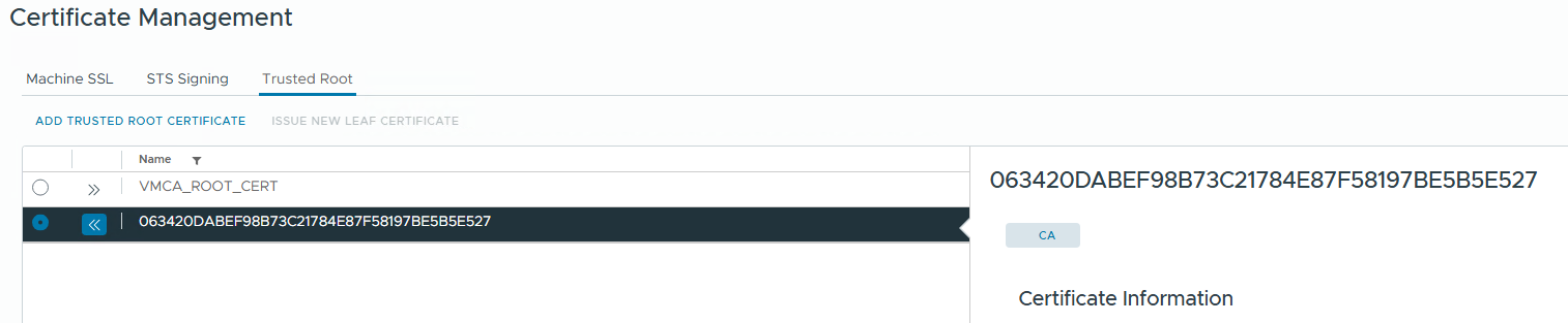 Trusted root certificate under certificate management is displayed in alphanumeric characters instead of alias name