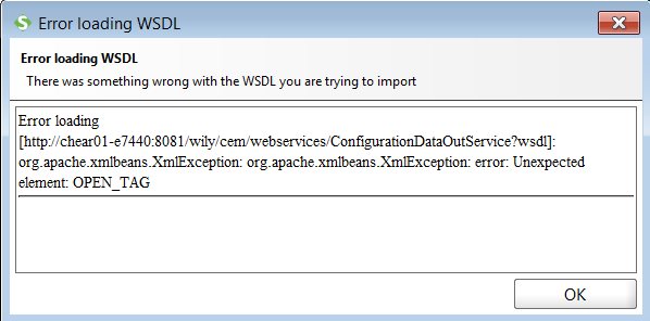 Error loading [http://chear01-e7440:8081/wily/cem/webservices/ConfigurationDataOutService]: org.apache.xmlbeans.XmlException: org.apache.xmlbeans.XmlException: error: Unexpected element: OPEN_TAG