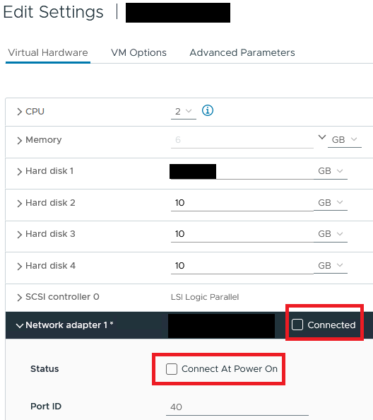 This issue occurs because the "Connect At Power On" option for the virtual machine's network adapter (and potentially CD/DVD drive) is not selected, this option may be deselected for certain operations (like template deployment or restoration) to prevent potential IP address conflicts or other network-related issues, especially in environments where network configurations are managed after initial deployment. This design allows administrators explicit control over device connection during automated power-on events or failover scenarios.