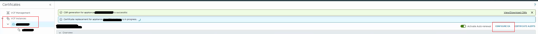Fleet Management > Certificates > VCF Instances > <Workload Instance> Configure CA"Once Microsoft CA integration is updated, the certificate renewal will complete successfully.