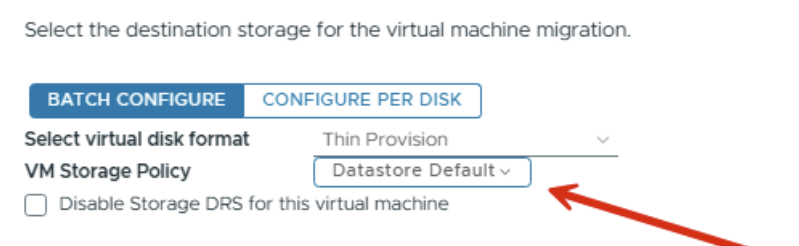 When migrating the VM to the new datastore, the storage policy was not adjusted to match the new datastore