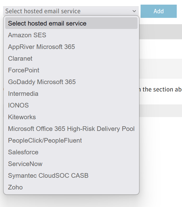 This article describes a step to take if your organization uses a public-cloud hosted email service, but would like to add a new 3rd party hosted mail service in your Client Net portal > Outbound routes > Hosted Email services