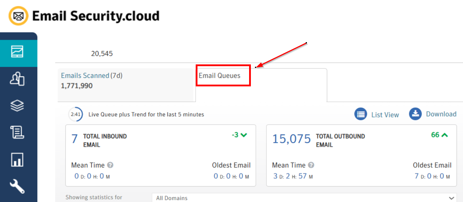 Email Queues provides up-to-date information about inbound and outbound mail queue lengths, broken down by domain. This data is now available in the ClientNet portal, both as a dashboard widget and in a detailed list view on the Tools menu. You can use this data to quickly detect and evaluate problems with your email queues.