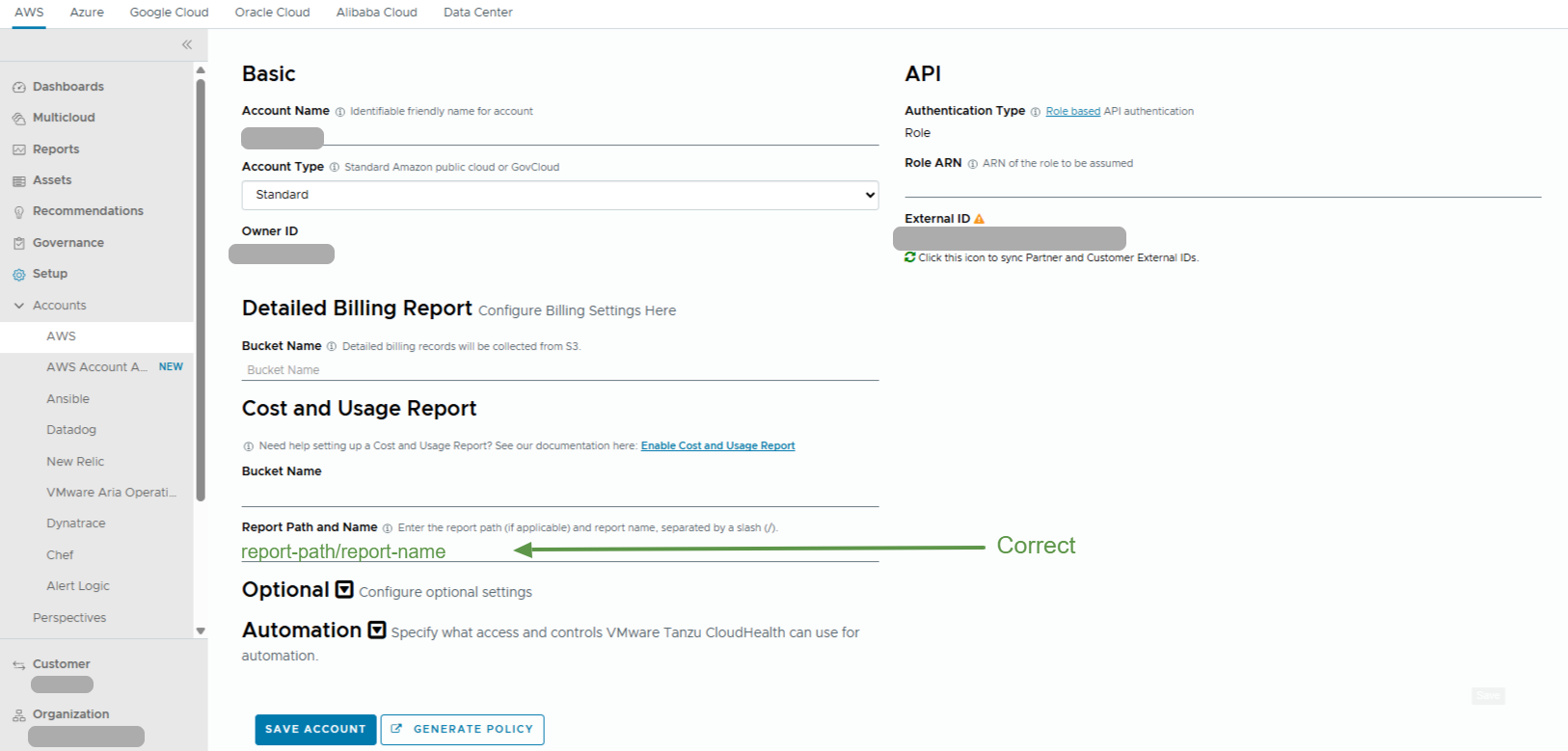 This field must only contain the Report Path and Report Name divided by a slash for AWS data to populate in the tenant.