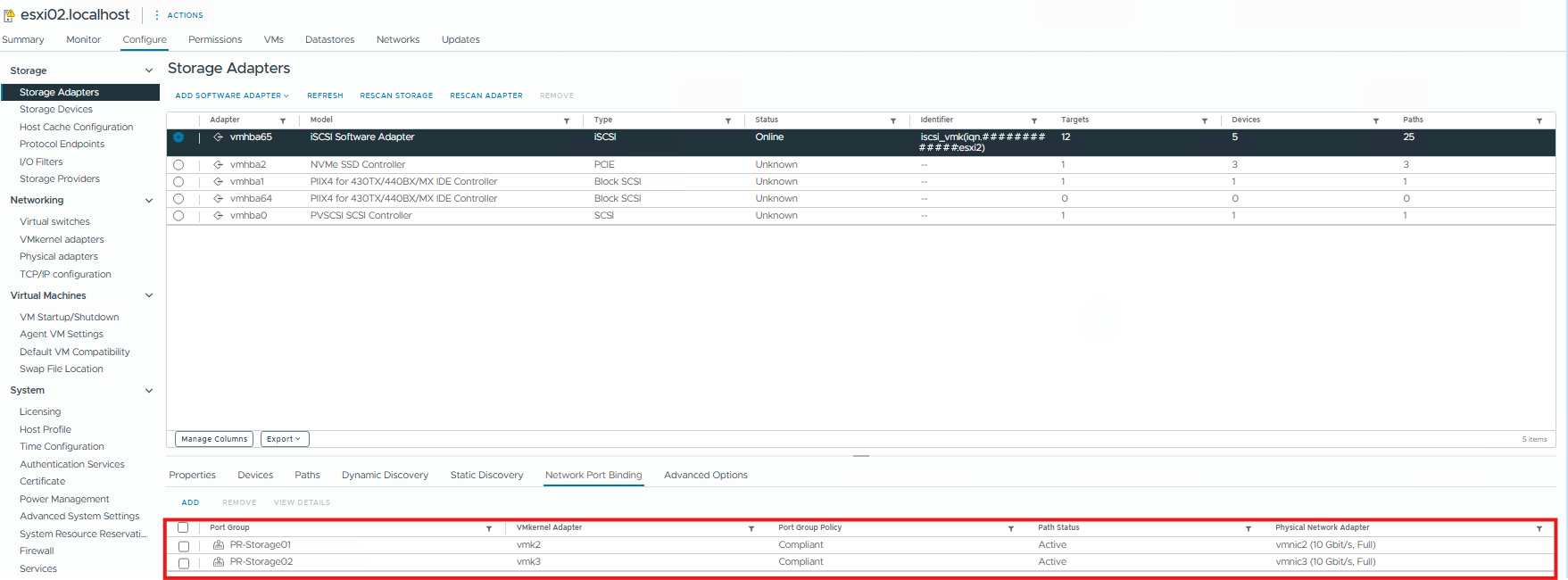 Post removing the Network port bindings configurations, we see below changes on the host after a storage rescan.