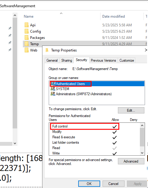 Access to software management Temp folder is insufficient.