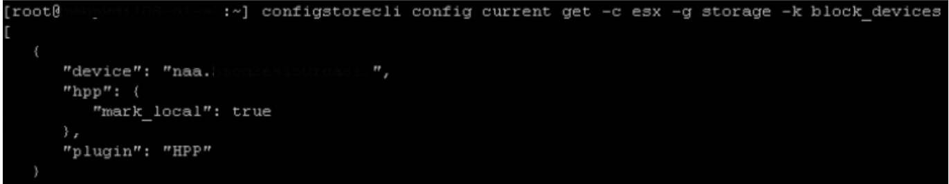 As per the path mentioned in the error message "/host-override/4c#####-######-33/esx/storage/block_devices/0/hpp/mark_local", validated the configuration in working and non-working ESXi host under storage block devices.