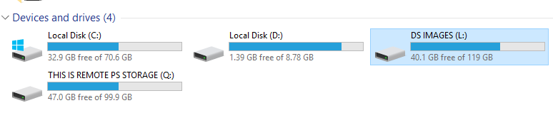 * Actual disk usage: The Primary PS Storage (Q: drive) shows 47.0 GB free of 99.9 GB used by the primary packages, while other drives, such as the DS IMAGES (L: drive), show additional usage (e.g., 40.1 GB free of 119 GB) for custom-located packages.