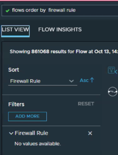An example of this behavior can be seen with the query "flows order by firewall rule" and in the left panel of the results on Filters / Firewall Rule it displays "No values available". It is expected that a list of firewall rule displays as seen in the image below: