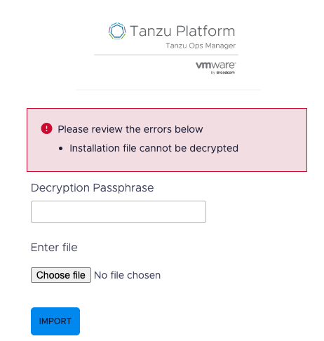When importing installation files on Ops Manager UI, "Installation file cannot be decrypted" error was shown although the correct decryption passphrase had been used.