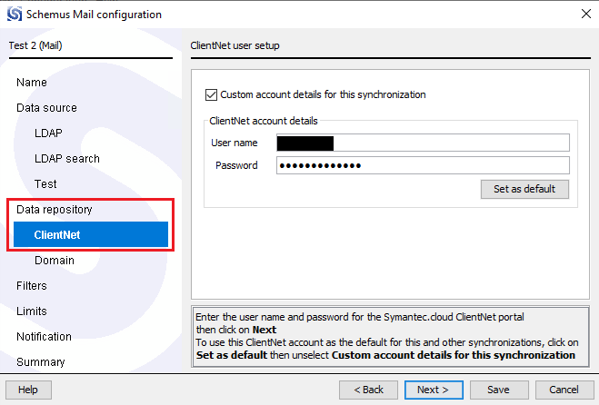 When running Schemus synchronization, it failed with an error "An error occurred whilst uploading data to Symantec.cloud : Authentication failed. Check username and password."