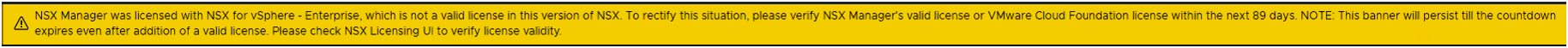 NSX Manager was licensed with <NSX license>, which is not a valid license in this version of NSX. To rectify this situation, please verify NSX Manager's valid license or VMware Cloud Foundation license within the next {<number of days>} days. NOTE: This banner will persist till the countdown expires even after addition of a valid license. Please check NSX Licensing UI to verify license validity.<number of days> value starts at 90 days and counts down each day.VCF 9.0