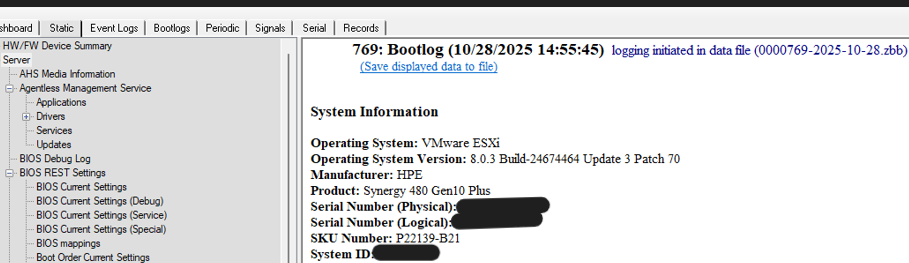 esxcfg-info -a will only display the logical serial number:\==+Hardware Info : |----BIOS UUID................................................0x7d 0xe7 0x8c 0x46 0xbf 0x3a 0x48 0xbf 0x83 0x50 0xe6 0xf0 0xee 0xa9 0x60 0x73 |----BIOS Vendor..............................................HPE |----BIOS Version.............................................I44 (2.42) |----BIOS ReleaseDate.........................................2025-06-13T00:00:00 |----BIOS Asset Tag........................................... |----BIOS Firmware Type.......................................1 |----Product Name.............................................Synergy 480 Gen10 Plus |----Vendor Name..............................................HPE |----Serial Number............................................########## (Logical serial number) |----Enclosure Serial Number.................................. |----Hardware Uptime..........................................532761045920 |----Ipmi Supported...........................................true |----BMC Version..............................................3.13
