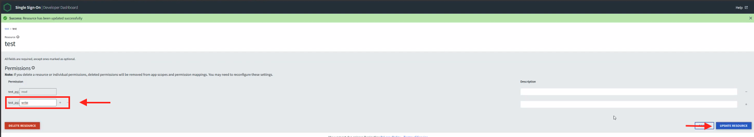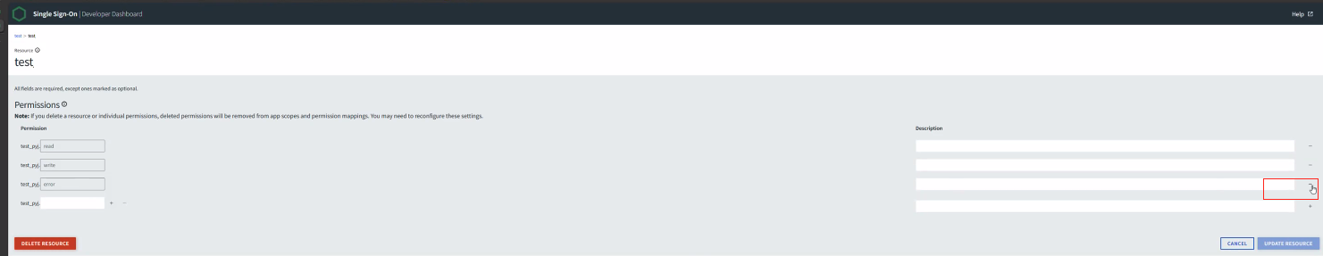 As a workaround, add a permission, type in it, and it enables the "Update Resource" button. This will allow saving the deletion of the unwanted permission.