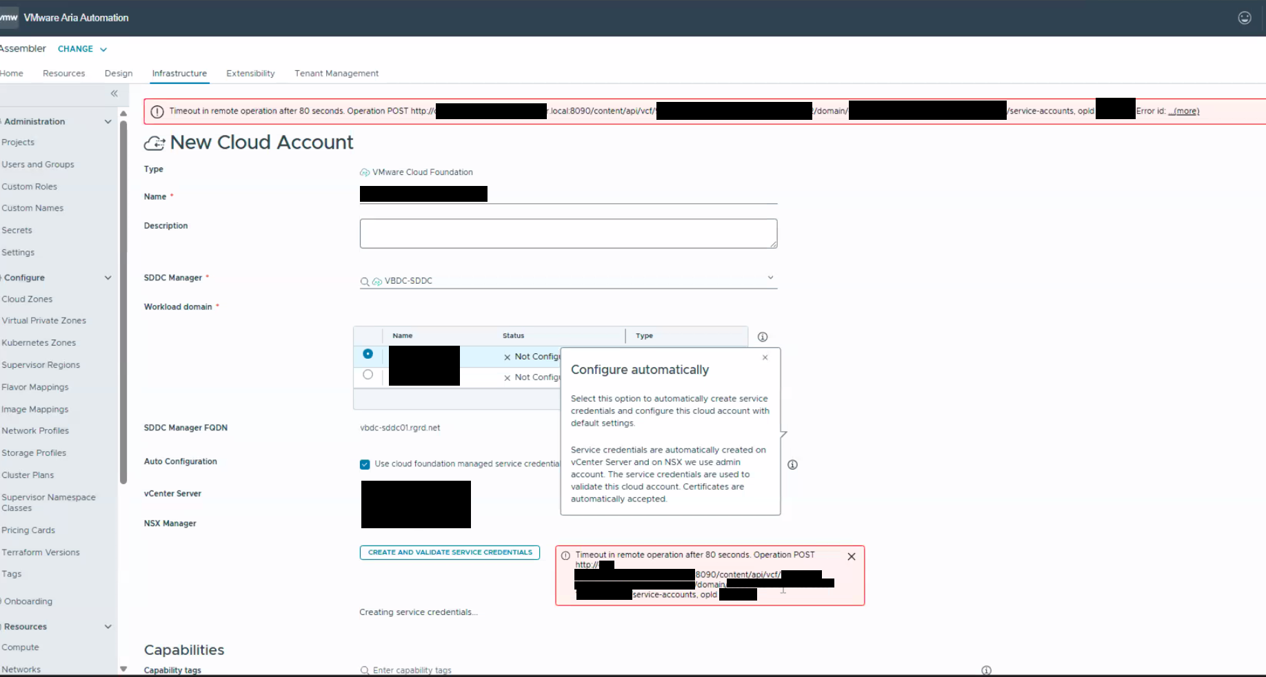 Timeout in remote operation after 80 seconds. Operation POST http://<vra_fqdn>:8090/content/api/vcf/########-####-####-####-############/domain/########-####-####-####-###########/service-accounts, opld ########