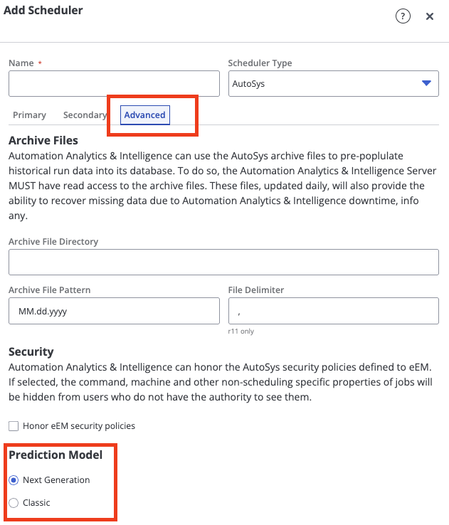 When adding an AutoSys scheduler there are two prediction models that can be selected from the Advanced tab of the Add Scheduler dialog box: