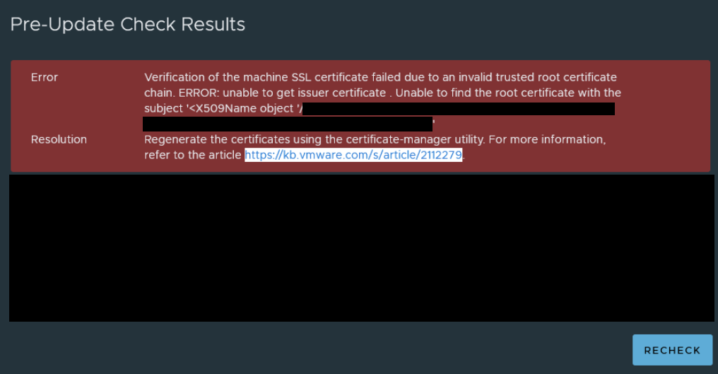 This precheck error occurs if the Signing Certificate of the Machine SSL Certificate is missing in the vCenter VECS Store.