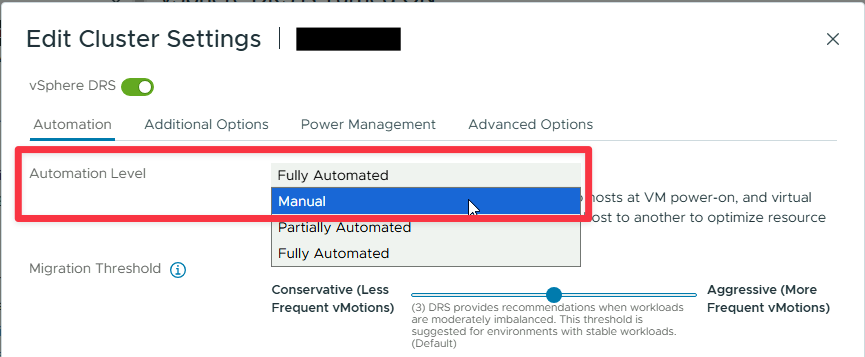 This will prevent DRS from automatically moving VMs between ESXi hosts. Refer to the following Documentation for further details on DRS configuration: Create a vSphere DRS Cluster - Machine Migration