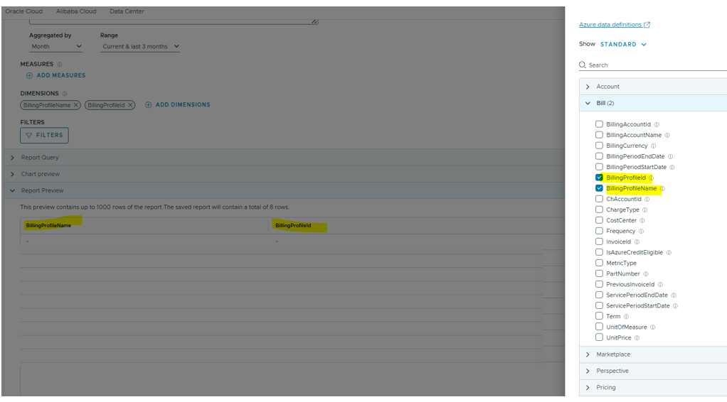 To view or categorize Azure costs at the Billing Profile level, create a FlexReport and include the following dimension fields: BillingProfileID and BillingProfileName.