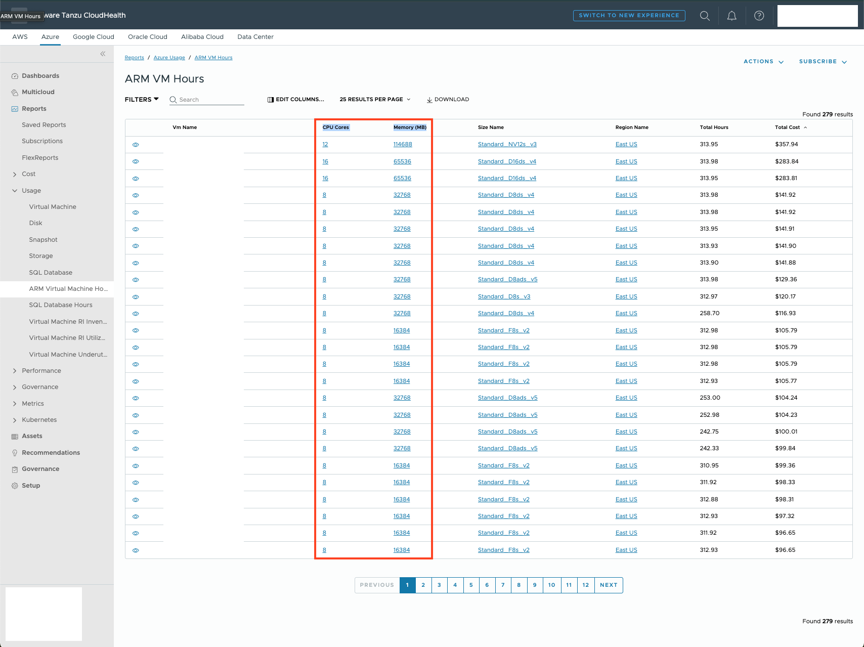For AWS, the EC2 Instance Hours report can pull in Virtual Cores and Memory (MB) columns:For Azure, the ARM Virtual Machine Hours report can pull in CPU Cores and Memory (MB) columns: