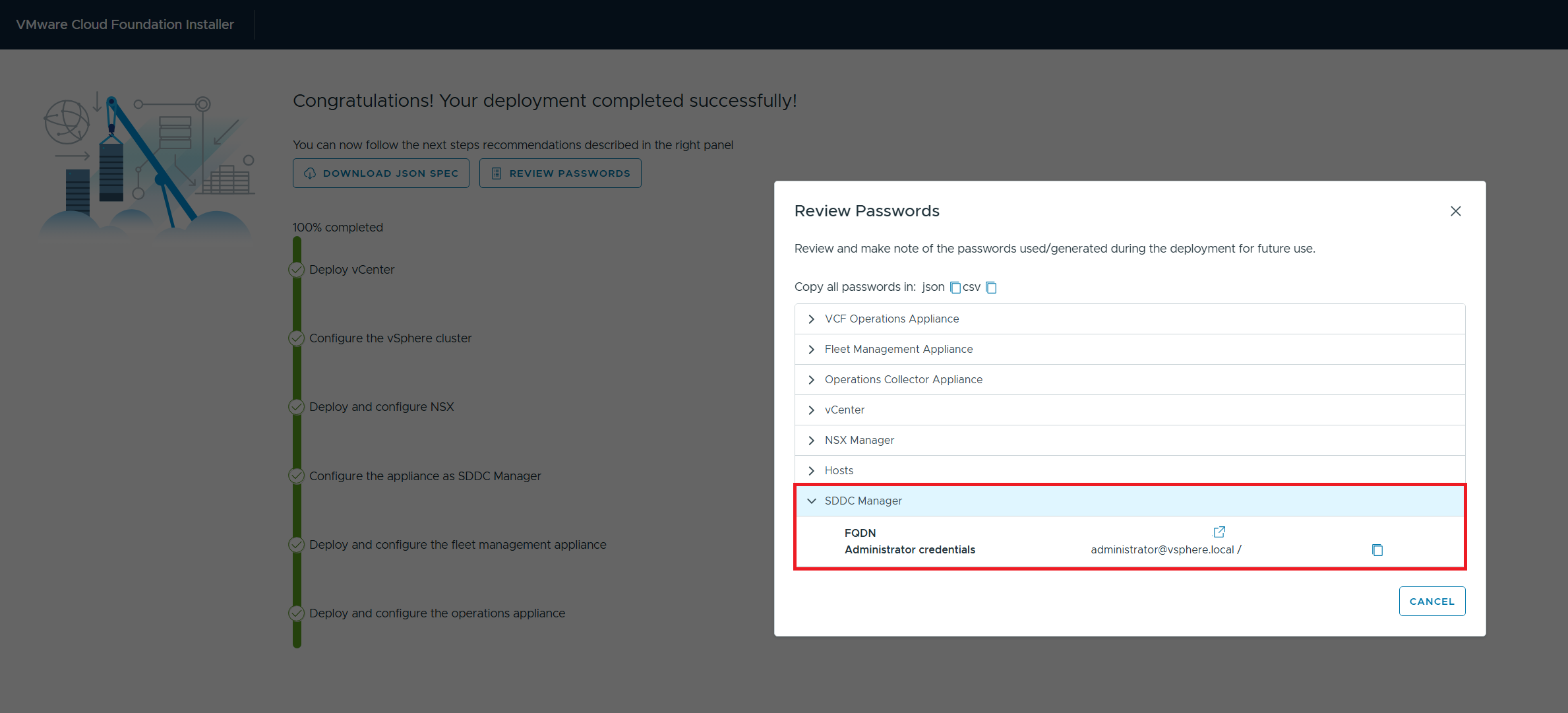 This is the Review Passwords Page for an environment where the VCF installer has newly deployed SDDC Manager.