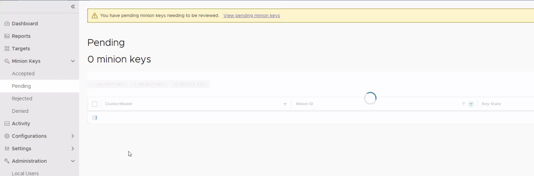 A subset of local and domain users who are members of the super user group are unable to load the Minion Key Management page (specifically under Minion > Accepted, Pending > Rejected) within the Aria Automation Salt-Config UI (also known as RAAS).