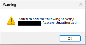 [Main UI Thread] ERROR Symantec.Cmaf.Security.AuthManager - Exception is caught while adding server: <SERVER_IP_HOSTNAME>. Reason: Unauthorized