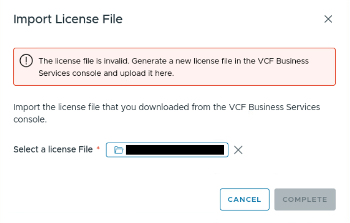 The license import process fails with the following error message: The license file is invalid. generate a new license file in the VCF Business Services console and upload it here.
