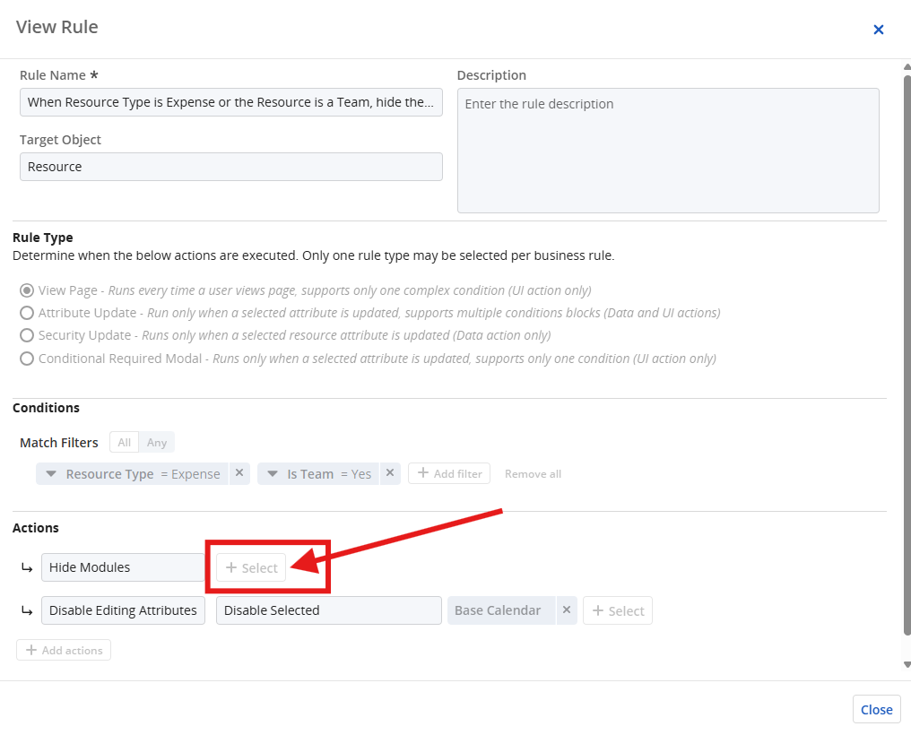 If the user-defined blueprint does NOT have the new 'Calendar' module configured, when the user looks at the Business Rule the selected 'Calendar' Module is not displayed in the rule. However, if the module is added into your custom blueprint, the module name will appear and the rule will function as expected.