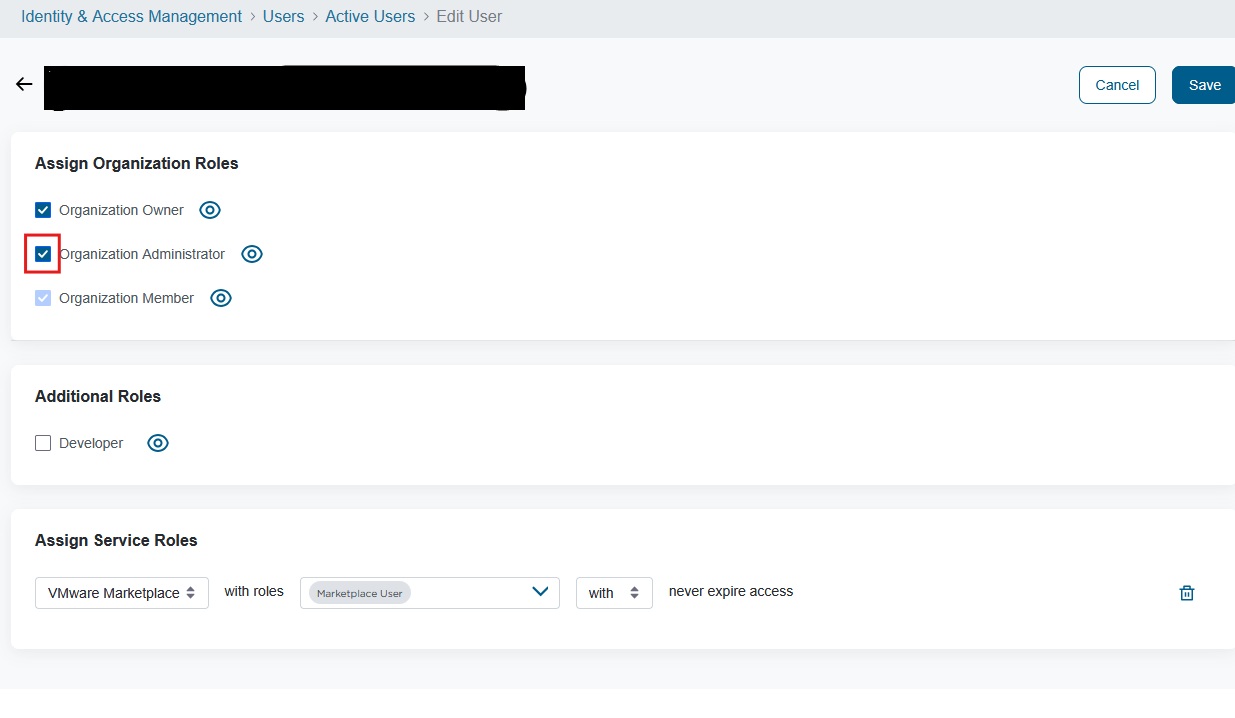 Service roles specify the privileges that an organization member has when accessing VMware Cloud Services that the organization uses.