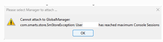 When trying to login to Smarts GUI getting error as "User has reached maximum Console Sessions"