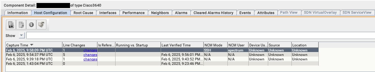 id>0x4820146</id>: This is the unique identifier for the attribute within Spectrum. The 0x482xxxx range is typically associated with NCM-related attributes.<!-- Last Capture for a device model -->: This comment directly tells you its purpose: it indicates the last time a configuration was successfully captured (or "snapshotted") for a particular device.com.aprisma.spectrum.app.scm.web.attribute.LastCapturedAttrReader: This class is a "reader." This means the attribute's value isn't stored directly on the device model in the SpectroSERVER database. Instead, when this attribute is requested (e.g., when you view the device's attributes in OneClick), this class is invoked to dynamically retrieve or compute the "last captured" timestamp from the NCM system.<volatile/>: This tag further supports the idea that it's a pseudo-attribute. Volatile attributes are not persistently stored on the model itself but are generated or retrieved on demand."Last Capture" value is the actually the value of the HostConfiguration model Creation Time.