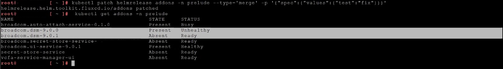 4. kubectl patch helmrelease addons -n prelude --type='merge' -p '{"spec":{"values":{"test":"fix"}}}'