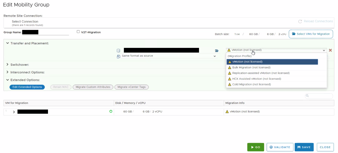 - When selecting an HCX migration option in the Mobility Group, show "not licensed" when VCD is used as the destination.