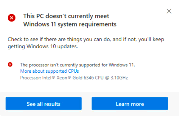 Under the Intel "Haswell" Generation, the CPU features presented to the VM do not meet the Windows 11 upgrade requirements, resulting in a processor compatibility error.