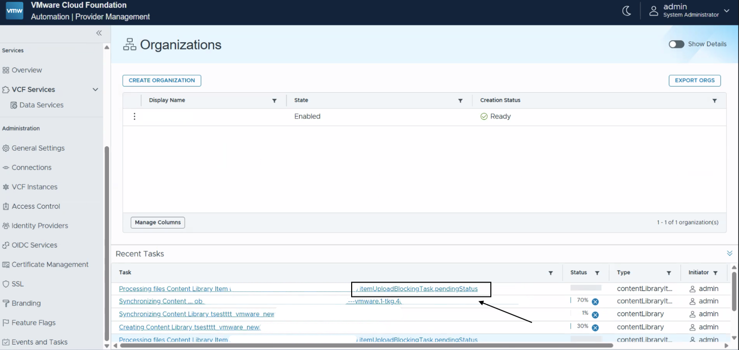 Behavior is only observed when content library is created from VCFA; direct vCenter creation does not encounter the blocking mechanism.
