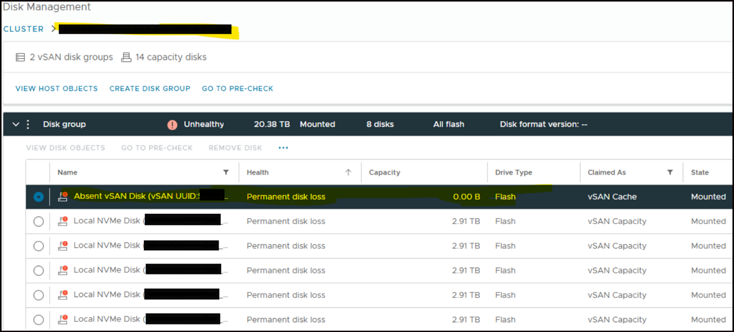vSAN disk appears absent in vSAN Disk Management. (vSphere Client > vSAN Cluster > Configure > vSAN - Disk Management > Select affected host > view the affected disk group containing the absent vSAN disk) with one or all disks in Permanent disk loss.