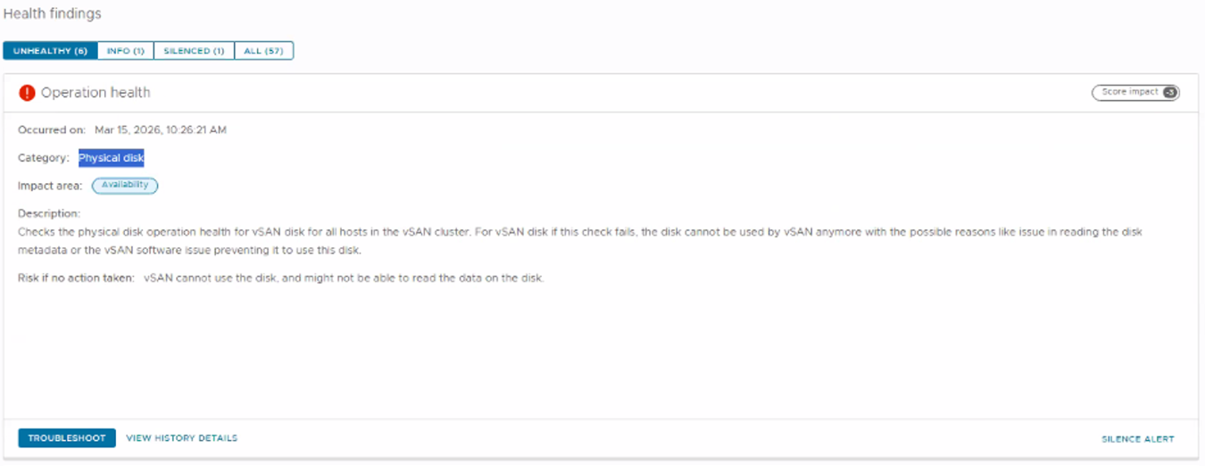 2025-11-22T13:53:37.985Z In(182) vmkernel: cpu80:2098032)HPP: HppScsiAADetermineStatus:57: Device naa.############ path vmhba1:C#:T#:L# hit an unrecoverable hardware error2025-11-22T13:53:37.985Z In(182) vmkernel: cpu80:2098032)HPP: HppPathGroupMovePath:688: Path "vmhba1:C#:T#:L#" state changed from "active" to "permanently lost"2025-11-22T13:53:37.985Z Wa(180) vmkwarning: cpu80:2098032)WARNING: HPP: HppDeviceUpdateState:5242: Device 'naa.############' is changing to 'permanent device loss' from 'on'.2025-11-22T13:53:37.985Z Wa(180) vmkwarning: cpu80:2098032)WARNING: ScsiDevice: 1794: Device :naa.############ has been removed or is permanently inaccessible.2026-02-03T11:48:51.022Z In(14) vobd[2097954]: [vSANCorrelator] 9152575353208us: [vob.vsan.lsom.devicerepair] vSAN device ###########-8686-9a2d-8034-################ is being repaired due to I/O failures, and will be out of service until the repair is complete. If the device is part of a dedup disk group, the entire disk group will be out of service until the repair is complete.2026-02-03T11:48:51.022Z In(14) vobd[2097954]: [vSANCorrelator] 9152543955667us: [esx.problem.vob.vsan.lsom.devicerepair] Device ###########-8686-9a2d-8034-################ is in offline state and is getting repaired.2026-02-03T11:48:51.032Z In(14) vobd[2097954]: [vSANCorrelator] 9152575363324us: [vob.vsan.pdl.offline] vSAN device ###########-8686-9a2d-8034-################ has gone offline.2026-02-03T13:02:23Z In(14) vsandevicemonitord[2103440]: [223791411904]: Device t10.NVMe____Dell_Ent_NVMe_#####_3.2TB______________############### state is DISKGROUP_UNDER_PDL2026-02-03T13:02:23Z In(14) vsandevicemonitord[2103440]: [223791411904]: Device t10.NVMe____Dell_Ent_NVMe_#####_3.2TB______________############### state is DISKGROUP_UNDER_PDL2026-02-03T13:02:23Z In(14) vsandevicemonitord[2103440]: [223791411904]: Device t10.NVMe____Dell_Ent_NVMe_#####_3.2TB______________############### state is DISKGROUP_UNDER_PDL To confirm if the disk error is genuine or a false alarm, run the following steps: