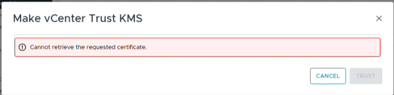 This issue occurs because the Network Load Balancer (NLB) is blocking the network traffic required to complete the "retrieve certificate" operation. Consequently, the vCenter Server cannot establish the necessary trust with the KMS.