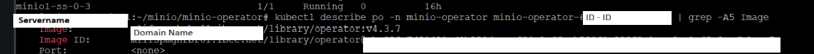 xxxx@servername :~ /minio/minio-operator# kubectl describe po -n minio-operator minio-operator-<id>-<id> | grep -A5 ImageImage : XXXXX.XXXX.XXX/library/operator:v4.3.7