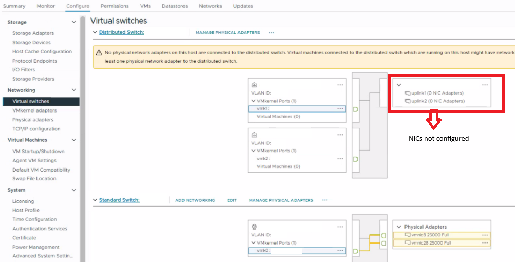 Under Configure > Virtual Switches, verify that no uplinks (physical adapters/NICs) are assigned to the distributed switch.esxcfg-vswitch -lSwitch Name Num Ports Used Ports Configured Ports MTU Uplinks########## 2520 1 128 1500