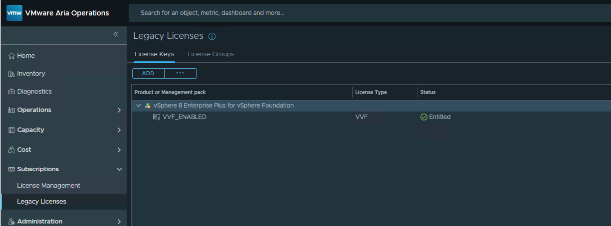 The newly added license is visible under Menu > Administration > Licensing > Licenses in vCenter Server; however, it has not been assigned to any assets. Because the license is not associated with an asset (in this case, vCenter Server instance), Aria Operations cannot retrieve or display it.