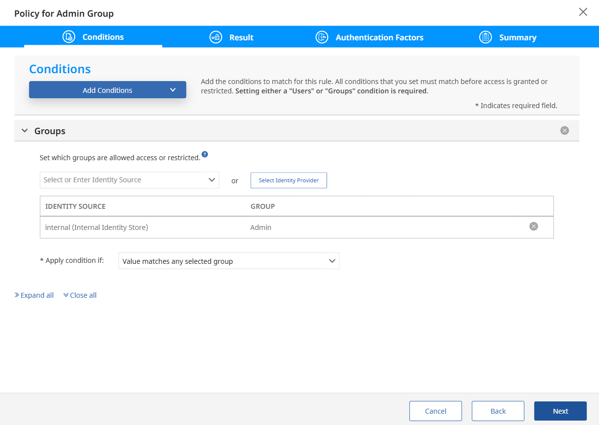 User "user1" belongs to "Admin" group. I have granted "Tenant Administrator" role to the "Admin" group and add a new "Policy for Admin Group" rule into the "AdminLoginPolicy" Authentication Policy with Group equals to Admin condition.